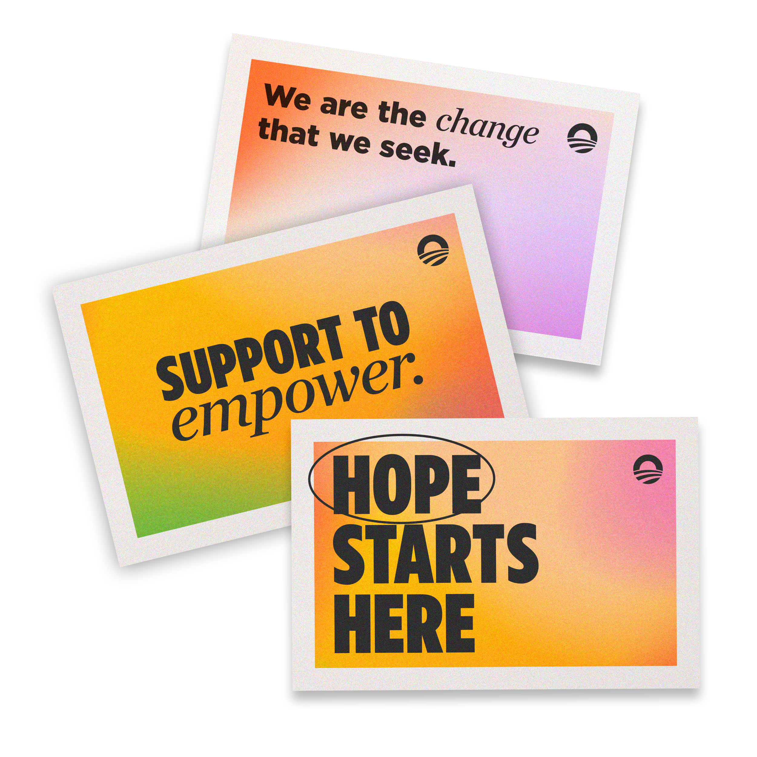 The Obama Foundation wanted their brand to echo their mission of rich storytelling and activism. This manifested into a design system aimed towards inspiring, empowering, and connecting people to change their world. We transformed their Hope mark into a dynamic beacon of forward progression to lead the brand. With storytelling at the forefront, we drew inspiration from traditional modular news layouts. Their new branding system establishes the exchange of stories as the standard with refreshed blacks and whites while opening up a world of vibrancy to express the passion within said stories through pops and fields of color.